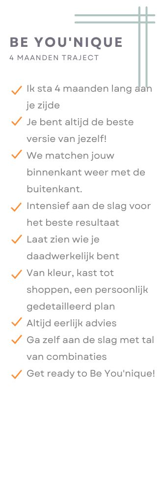 Door niet alleen te kijken naar jouw uiterlijke kenmerken, maar ook te kijken naar wie jij bent, wie jij wilt zijn en wie jij wilt uitstralen. We gaan jouw binnenkant weer met de buitenkant laten matchen!